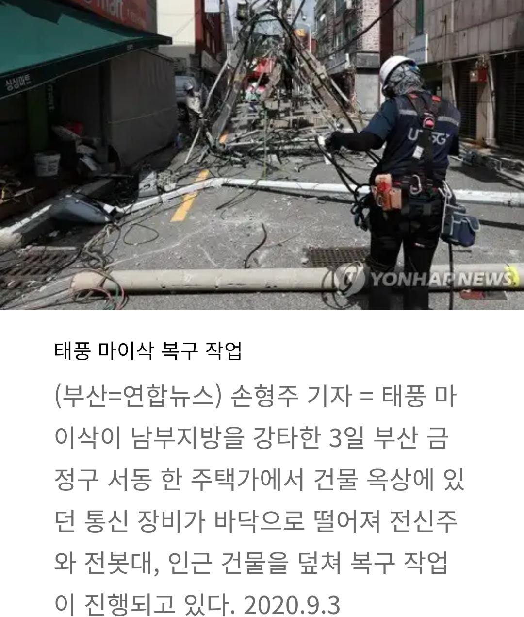 매미급이라던 '마이삭' 부산 피해규모는 지난해 타파 수준, 김선호기자, 사회뉴스 (송고시간 2020-09-03 17:17)