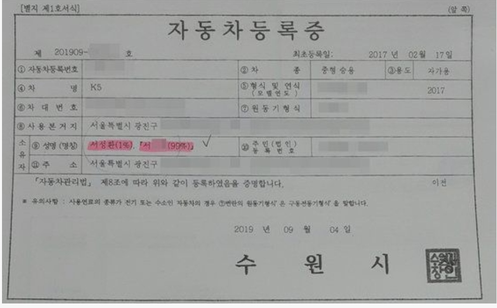 작년 K5(1999cc) 차량을 아버지와 공동명의로 구입