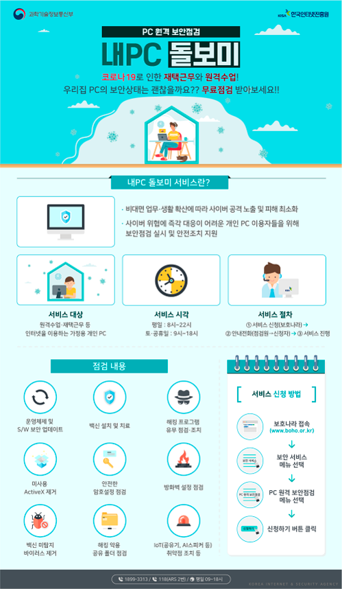 내 PC 보안, 정부 원격 점검 과기정통부, ‘내 PC 돌보미’ 10일부터 실시 전국민 신청 가능 "안전한 비대면 환경 조성" 33억, 예산낭비 국민 PC 임의조종 음모 아닌가? 개인정보보호 뒷전