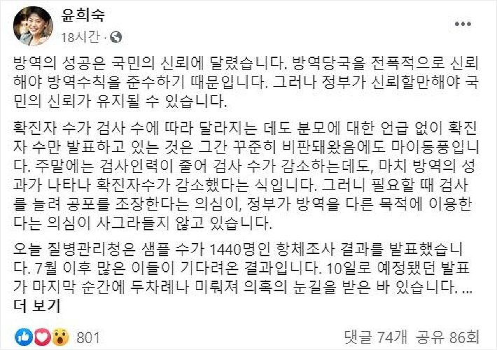 윤희숙 "검사량 늘려 공포 조장"…정부 "충격적"