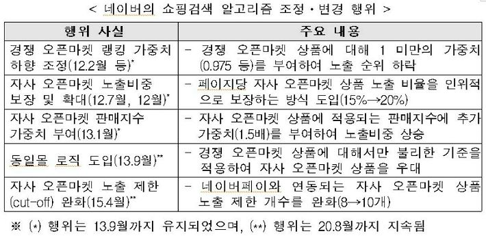 공정위의 조사결과 11번가, G마켓, 옥션, 인터파크 등의 오픈마켓과 경쟁하는 네이버 쇼핑 부문은 상품정보 검색순위를 결정하는 과정에서 자사 오픈마켓이 우선 노출되도록 수차례에 걸쳐 검색알고리즘을 조정·변경한 것으로 드러났다.