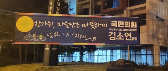 김소연 국민의힘 대전유성구을 당협위원장이 지난달 26일 '달님은 영창(映窓)으로'라는 문구가 포함된 플래카드를 걸었다. [김 당협위원장 페이스북 캡처]