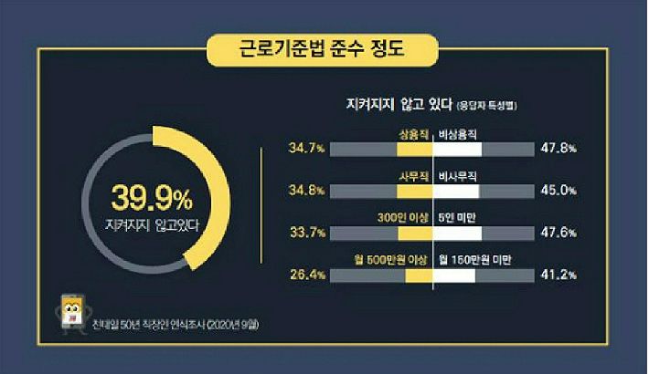 ◆ 전민기> 그렇습니다. 그래서 응답자들은 직장 내에서 잘 지켜지지 않는 근로기준법 내용을 보니까 노동시간과 휴가 이건 사실 가장 기본적인 건데 51%.