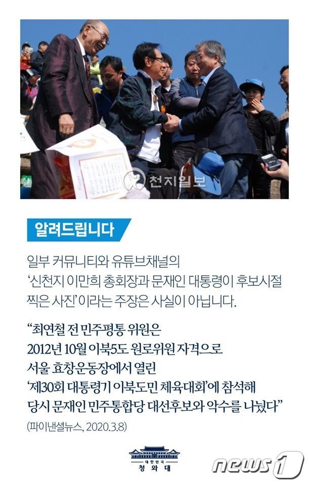 이와 함께 청와대는 일부 커뮤니티와 유튜브 채널에서 ‘이만희 신천지 총회장과 문 대통령이 2012년 대선후보 시절 찍은 사진’이 떠도는 데 대해서도 “사실이 아니다”라고 반박했다.