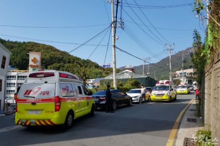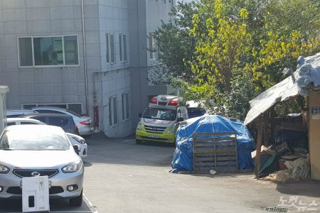 지난 14일 코로나19 확진자가 무더기로 발생한 부산 해뜨락요양병원 앞 도로에 119 구급 차량이 확진자 이송을 위해 대기하고 있다.(사진=박진홍 기자)