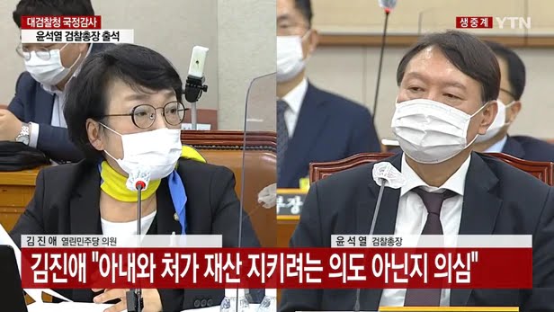 이런 문제를 제기한 것은 김진애 열린민주당 의원이다. 김 의원은 이날 국정감사에서 윤 총장 부부의 재산 문제를 꺼내들면서 “윤 총장 부부를 보면 재산이 꽤 많다. 65억원 정도”라며 “굉장히 저거한 게 본인은 2억원에서 2억 5000만원 사이, 그리고 나머지 대부분이 부인의 재산”이라고 말했다.