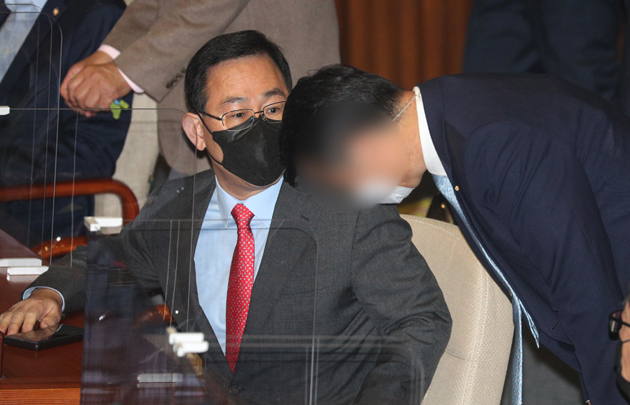 주호영 국민의힘 원내대표가 28일 오전 서울 여의도 국회에서 열린 본회의장에서 주 원내대표가 문재인 대통령의 시정연설을 앞두고 사전환담에 참석하려다 의장실 앞에서 몸수색을 요구 받은 것에 대해 청와대 경호처 관계자가 사과를 위해 찾아오자 항의하고 있다. (사진=윤창원 기자)