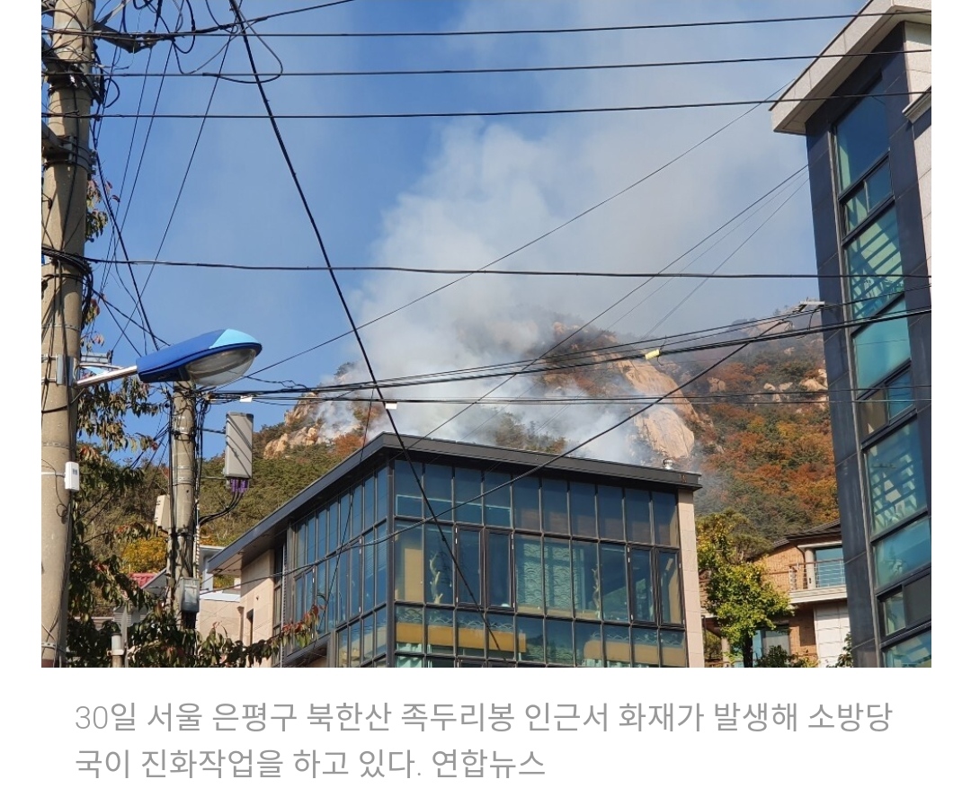 30일 서울 은평구 북한산 족두리봉 인근서 화재가 발생해 소방당국이 진화작업을 하고 있다. 연합뉴스