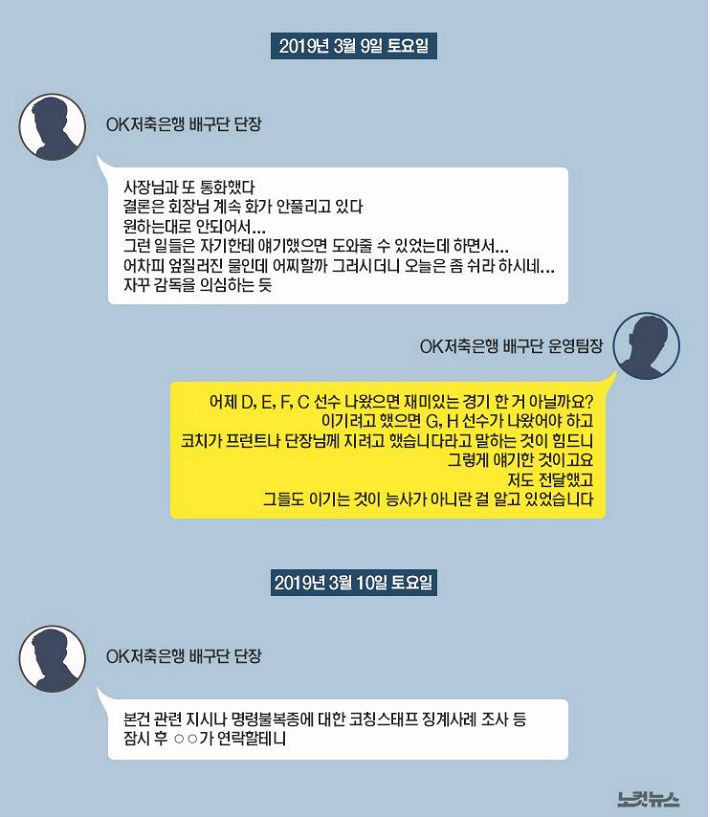 글 싣는 순서①[단독]OK금융그룹, 고의패배 지시 의혹…KOVO는 '혐의 없음' ②[단독]"회장님, 면목 없습니다"…OK금융 고의패배 지시 의혹 전말은? (계속) "정말 죄송합니다. 후보선수들로 넣었는데.