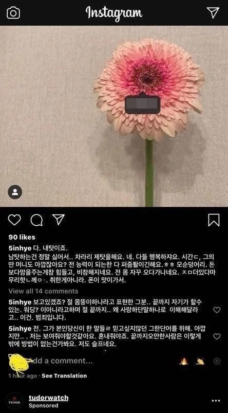 게시글에 따르면 오인혜는 지난 14일 새벽 1시경 자신의 인스타그램에 “다 내탓이죠. 남 탓하는 건 정말 싫어서, 차라리 제 탓을 해요”라며 “모순덩어리, 돈 보다 마음을 주는 게 참 힘들고 비참해지네요”라고 적었다.
