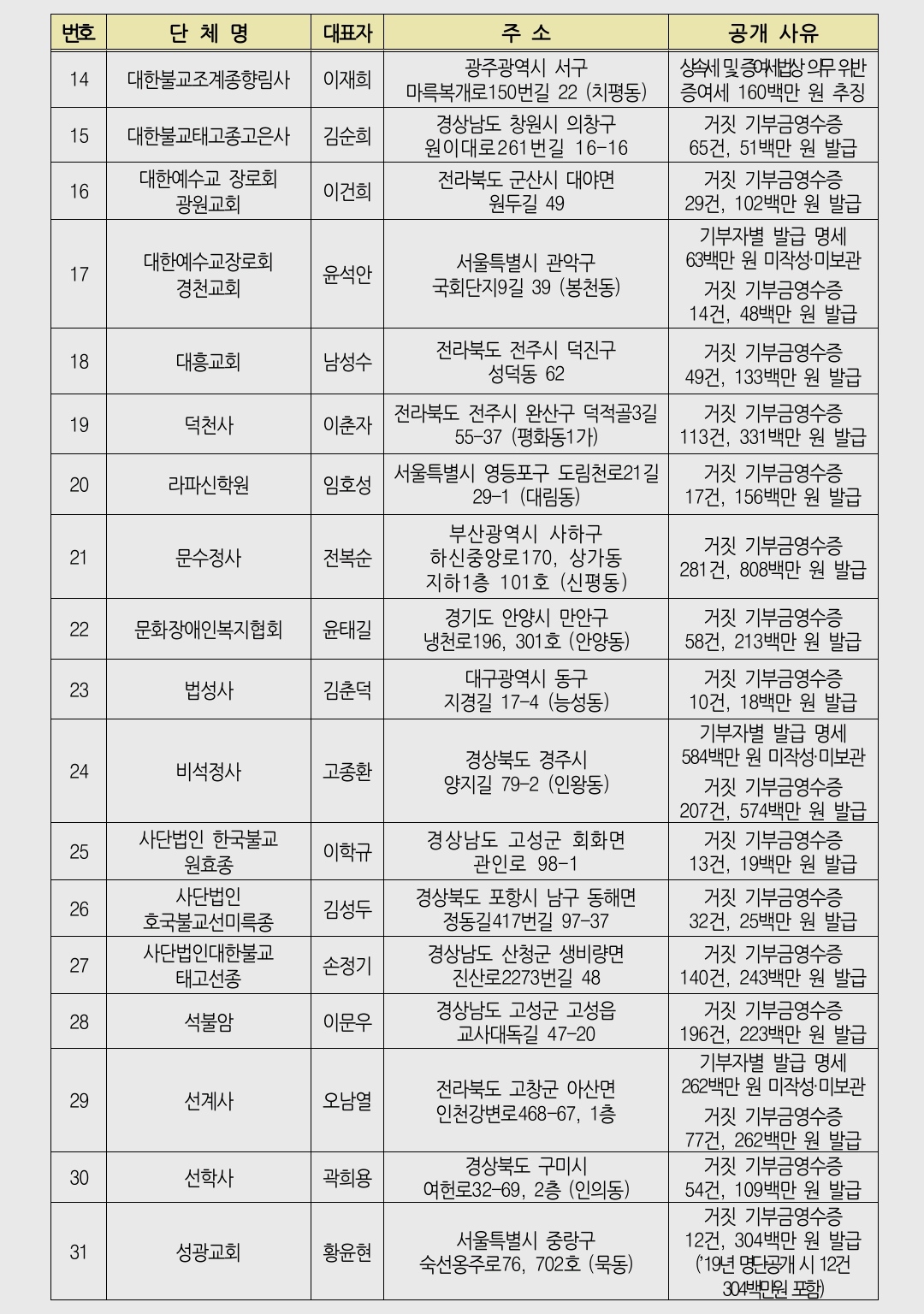 거짓 기부금 영수증을 5회 이상 또는 5천만 원 이상 발급한 단체 60개와 기부금 영수증 발급명세서를 작성·보관하지 않은 단체 4개, 증여세 등을 내지 않아 천만원 이상 추징당한 단체 15개의 정보도 공개됐습니다.