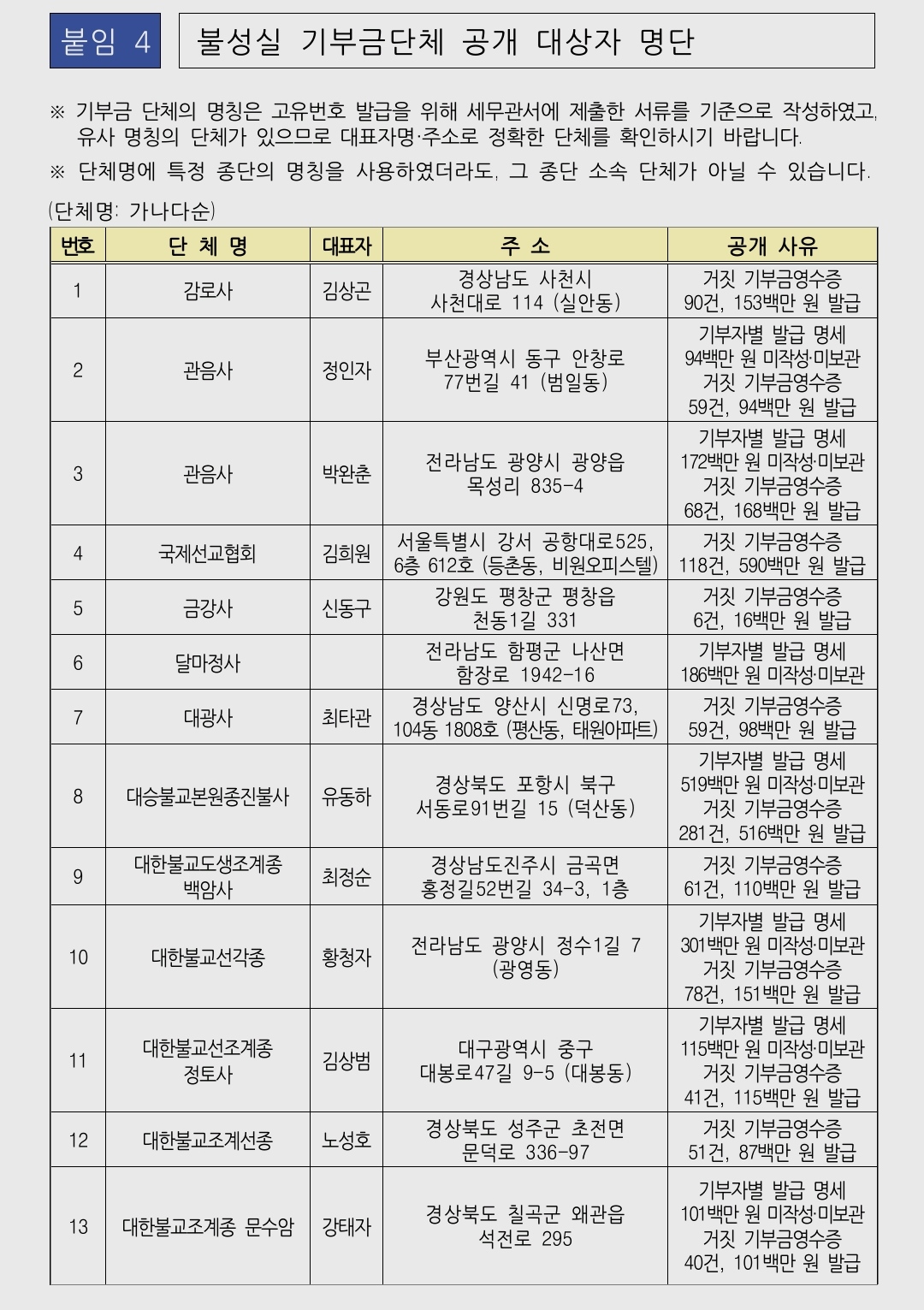 부산에 위치한 문수정사가 총 281건, 8억8백만원의 거짓 기부금영수증을 발급했고 서울의 국제선교협회가 118건, 5억9천만원의 허위 기부금영수증을 발급했습니다. 인천에 위치한 학교법인 재능학원이 상속세 및 증여세법 상 의무위반으로 증여세 7억9천6백만원을 추징당한 것으로 나타났습니다.