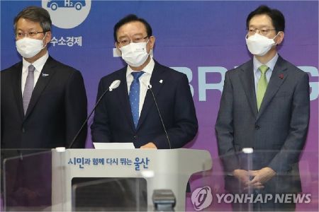 17일 오전 울산시청 프레스센터에서 김경수 경남도지사(오른쪽부터), 변성완 부산시장 권한대행, 송철호 울산시장이 가덕도 신공항 건설 지지 발표 기자회견을 하고 있다. (사진=연합뉴스)