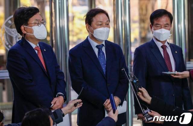 박완수 국회 행정안전위원회 국민의힘 간사(가운데)와 서범수(왼쪽), 최춘식 의원이 21일 오후 서울 서대문구 경찰청을 찾아 이용구 법무부 차관의 과거 택시기사 폭행 의혹 사건 내사종결 관련, 경찰청장과 면담하기 전 취재진 질의에 답하고 있다. 2020.12.21/뉴스1 © News1