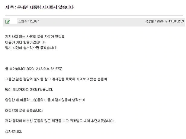 대표적 친문(親文) 성향 맘카페인 ’82쿡' 게시판에 ‘문재인 대통령 지지하지 않는다’는 제목의 글이 지난 13일 올라왔다. “투표권 생기고 진보만 찍어온 사람인데, 조국 사태 이후 현 정부에 돌아섰다. 촛불 집회 (참가) 후 더 나은 세상이 되길 희망했다. 저 같은 사람들이 더 분노한다”는 내용이었다. 이 글엔 지금까지 댓글 620개가 달렸다. 이 카페 글에 그간 많아야 댓글 200개 정도가 달린 것과 비교하면 폭발적인 반응이다. 댓글 대부분은 “나도 기대했는데 너무 실망했다” “끔찍한 4년” 등 동조하는 내용이 달렸다. 이보다 20분 먼저 올라온 ‘문재인 대통령을 지지한다’는 글엔 댓글이 66개 달리는 데 그쳤다.