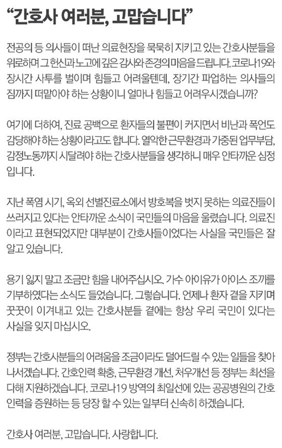 지난해 9월엔 의사와 간호사의 ‘갈라치기’ 논란도 있었다. 문 대통령은 SNS 메시지에서 간호사들을 향해 “의사들이 떠난 의료 현장을 묵묵히 지키고 있는 간호사분들을 위로한다”고 썼다. “장기간 파업하는 의사들의 짐까지 떠맡아야 하는 상황”이라는 표현도 있었다. 의사 파업이 진행되는 상황이었다. 당연히 간호사를 격려하는 척하면서 의사들을 압박했다는 해석이 나왔다. 의사들뿐 아니라 일반 네티즌들도 “대통령이 이렇게 편 가르기 해도 되나”, “국민을 반으로 쪼개서 싸우게 하는 대통령” 등의 댓글을 달았다.