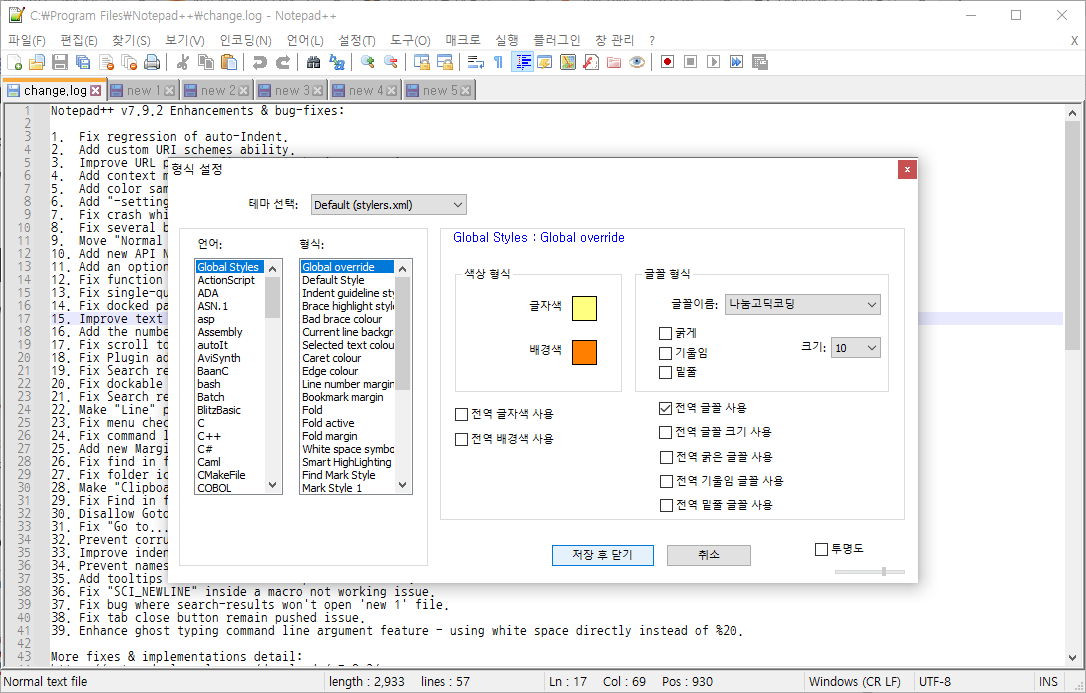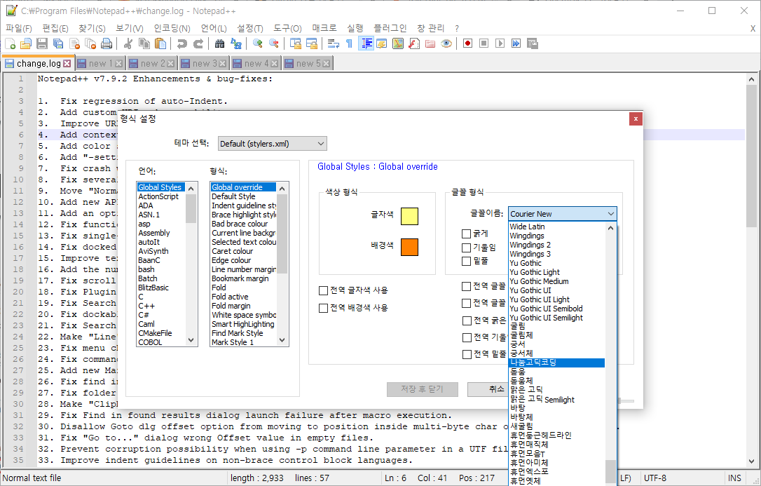(1) 우선 설치된 Notepad++ 를 실행해서 "설정 - 형식 설정" 메뉴를 클릭하면 아래와 같이 "형식 설정" 팝업창이 뜬다.