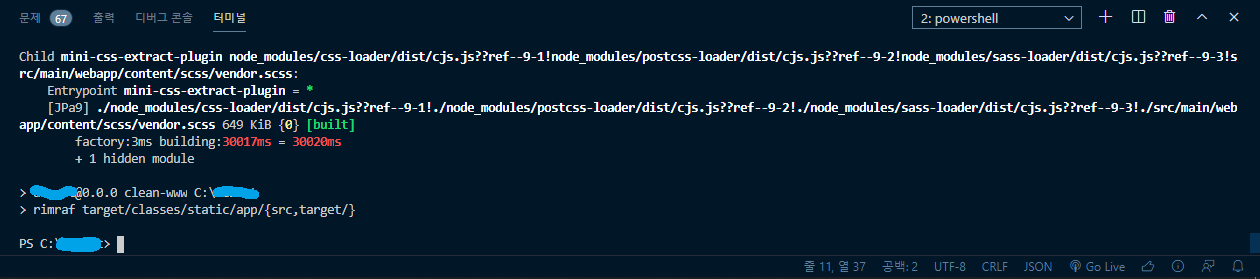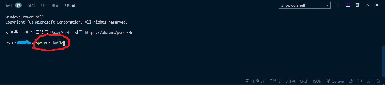 그러면 새로 뜬 powershell 에다가 npm run build 입력 후 엔터 치자.