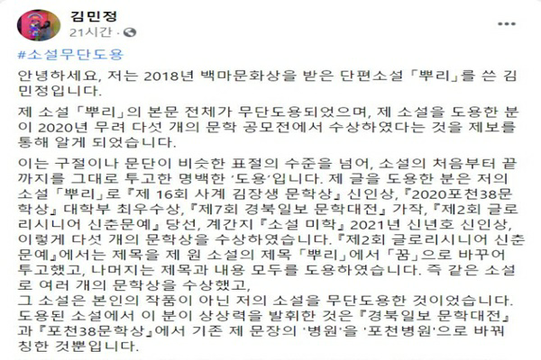 앞서 2018년 백마문학상을 받은 소설 ‘뿌리’의 김민정 작가가 지난 16일 “제 소설 ‘뿌리’의 본문 전체가 무단 도용되었으며 제 소설을 도용한 분이 2020년 다섯 개의 문학 공모전에 수상하였다는 걸 제보를 통해 알게 되었다”고 폭로하면서 손씨의 연이은 무단표절 및 도용 행적이 밝혀지고 있다.