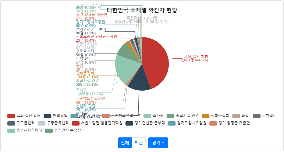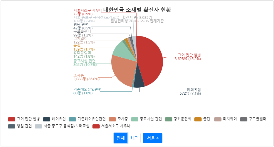 우선 대한민국 소재별 확진자 현황을 서울, 전체기간 기준으로 보자.
