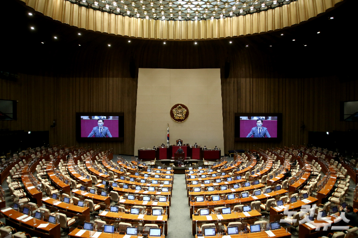 지난해 12월 국회 본회의장에서 남북관계발전에 관한 법률 일부개정안(대북전단금지법 개정안)과 관련해 무제한 토론(필리버스터)이 진행되는 모습. 윤창원 기자