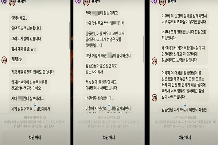 그는 감동란에게 "A씨에게 잘 보이려 비위를 맞춰주고 싹싹 빌던 때다. 감동란님과 일면식도 없는 사이라 아무 말이나 했다"며 "지금은 제가 너무 팬이고 진심으로 응원드린다. 거듭 사과드리며 꼭 받아주시기를 간절히 부탁드린다"고 애원했다.