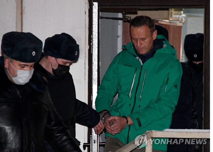 러시아 야권 운동가 알렉세이 나발니가 18일(현지시간) 30일간 구속하라는 법원의 판결 직후 수갑을 찬 채 모스크바 외곽 힘키 경찰서 밖으로 나오고 있다. (사진=연합뉴스)