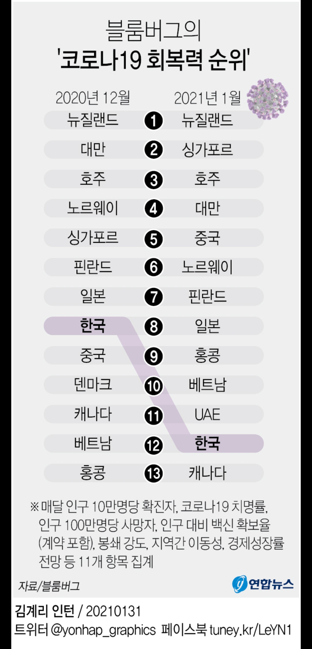 최근 순위 하락은 코로나19 백신 관련 지표가 부진한 영향이 크다. 블룸버그는 매달 인구 10만 명당 확진자, 코로나19 치명률, 인구 100만 명당 사망자, 인구 대비 백신 확보율(계약 포함), 봉쇄 강도, 지역 간 이동성, 경제성장률 전망 등 11개 항목을 집계해 100점 만점으로 점수를 낸다. 이를 통해 주요국이 사회·경제적 혼란을 최소화하면서 코로나19를 얼마나 잘 통제하는지 나라별로 평가하는 것이다