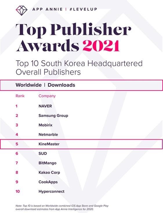 2020년 다운로드 기준 전 세계 상위 5위는 모바일 동영상 편집 앱 키네마스터가 차지했으며, 네이버, 삼성, Mobirix, 넷마블의 뒤를 이어 선정됐다. 이에 따라 키네마스터는 2020년 한 해 동안 전 세계에서 다섯 번째로 가장 많은 다운로드를 기록한 국내 퍼블리셔로 우뚝 섰다.