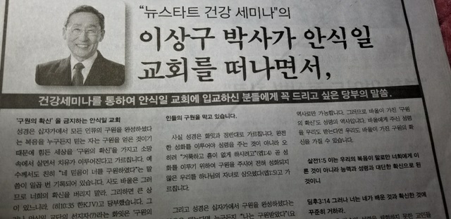 이어서 지난 10월 10일자 미국에서 발행되고 있는 <미주중앙일보> 전면 광고를 통해 자신은 안식교를 떠났다고 공개하는 글을 게재했다(참고 http://www.amennews.com/news/articleView.html?idxno=16564). ‘뉴스타트 건강 세미나의 이상구 박사가 안식일교회를 떠나면서, 건강세미나를 통하여 안식일교회에 입교하신 분들에게 꼭 드리고 싶은 당부의 말씀’이라는 긴 제목의 글이다. 자신이 안식교를 정식 탈퇴했으며, 또한 자신의 건강 세미나를 통해 안식교에 입교한 신도들에게 안식교의 거짓된 교리와 그 실체를 알리겠다는 의도였다.
