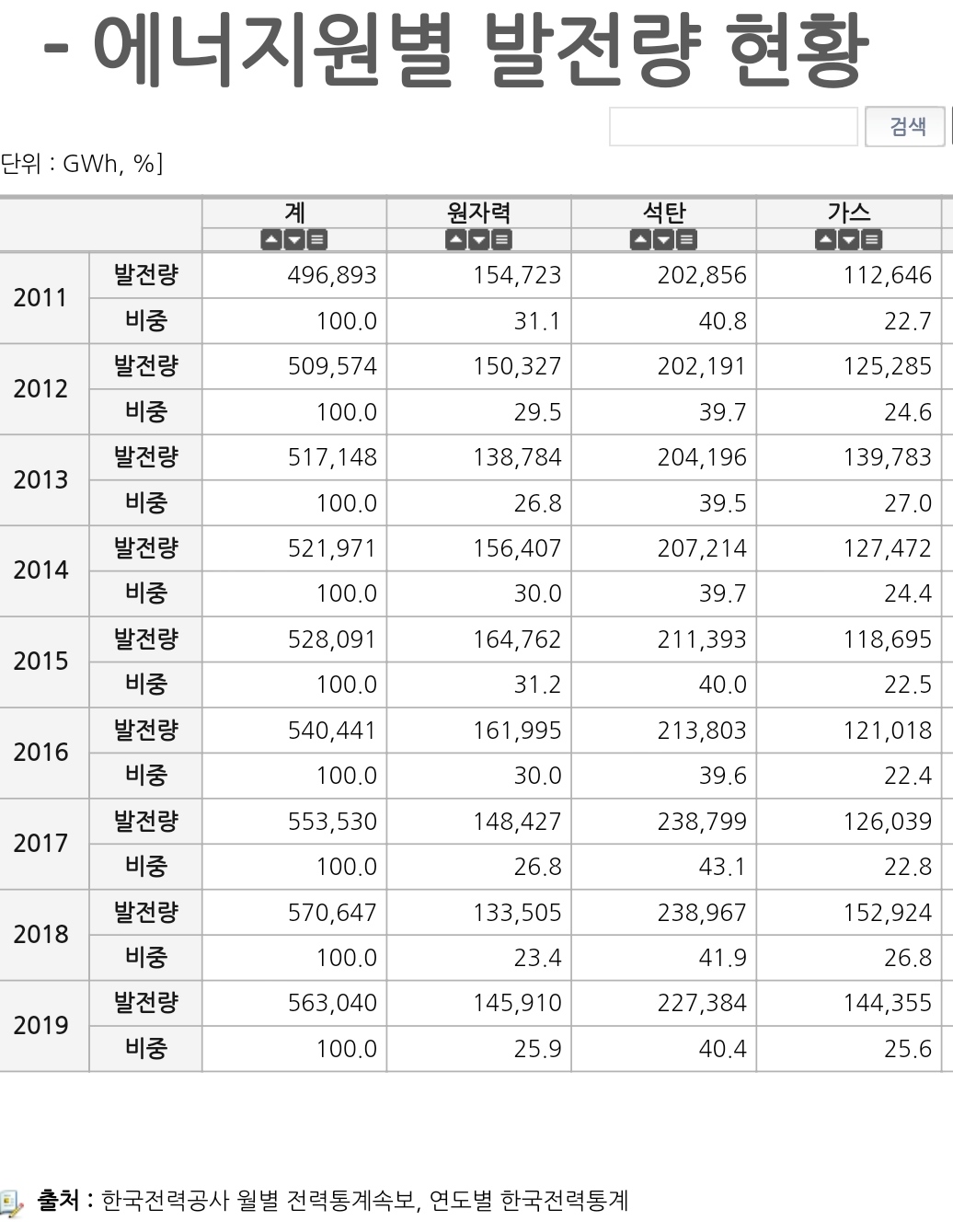 결과적으로 2017년을 분기점으로 해서 원자력이 조금 줄어들고, 석탄발전이 늘고, 가스발전이 늘었다.