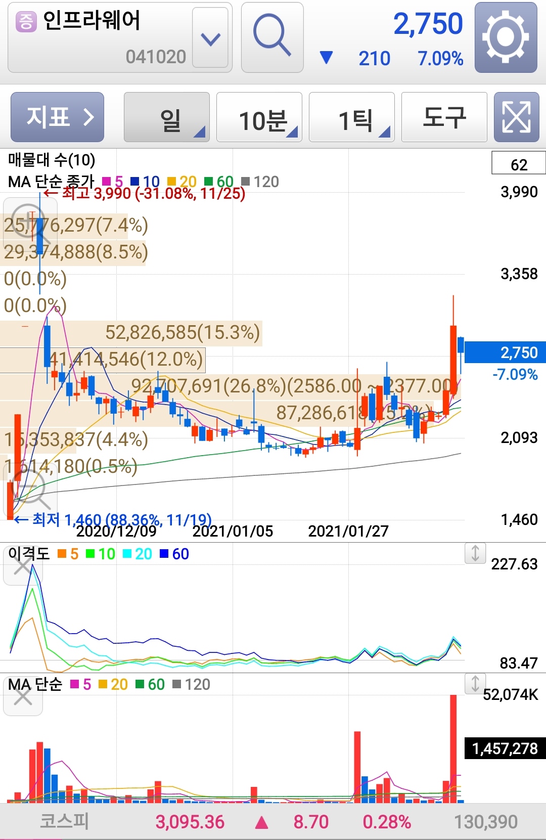 인프라웨어는 살짝 사이드인 것 같다. 스마트폰용 오피스를 만든 회사이지만, 수익이 나지 않는 실정인데, 이런 기술력이면 다른 IT쪽을 넘봐도 충분히 경쟁력이 있다는 생각이 든다. 그래서 가상화폐 시장에 발을 걸쳤을 거라 기대했다. 조금 올랐다가 조정을 받고 있는 것 같다. 훅 하고 떠주길 바란다.