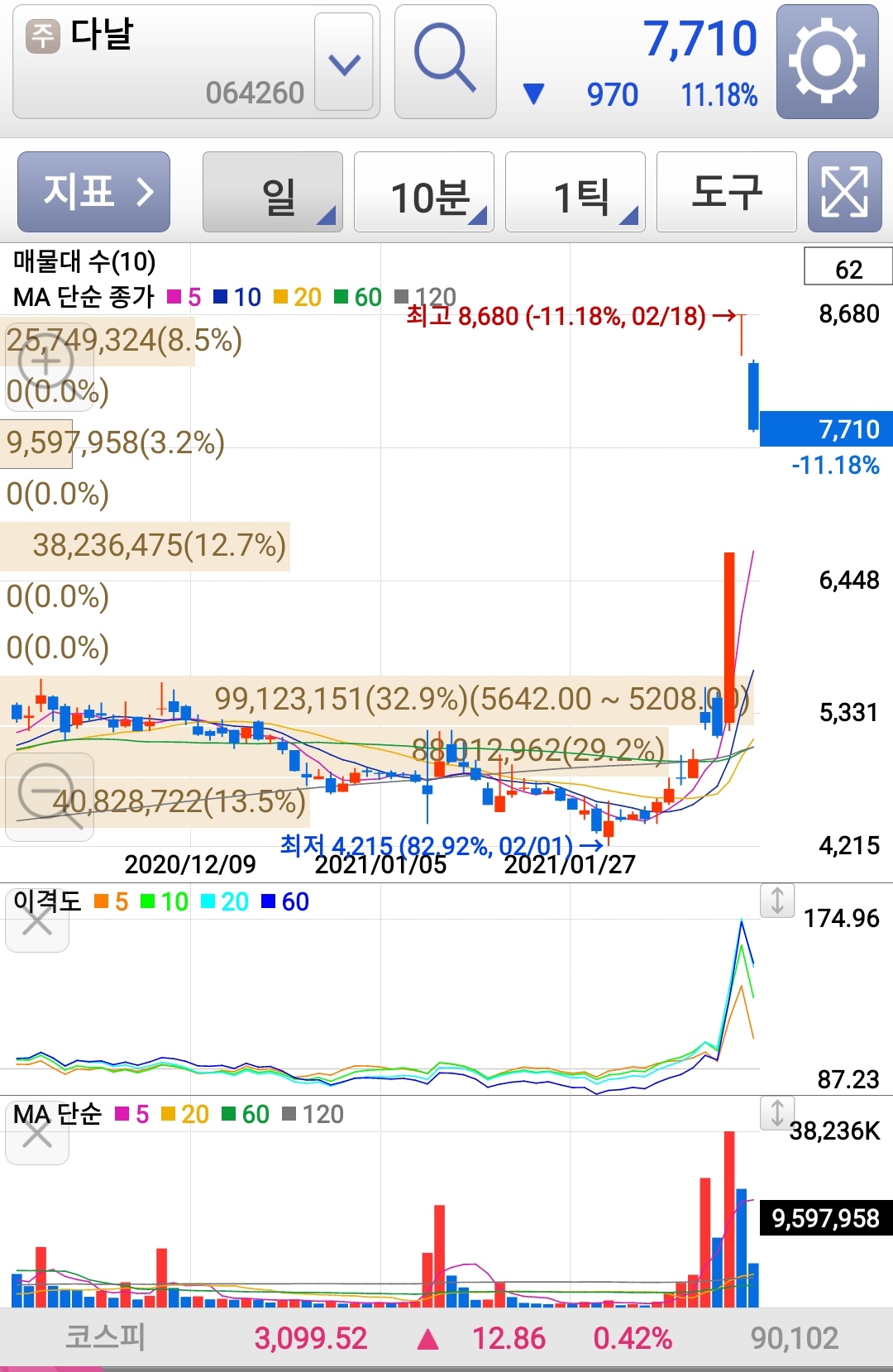 2일 상을 치더니 어제인 2일째 훅 떨어져 마감했다. 그러다가 오늘은 아주 떨어져버리고 있다. 부침이 심하다 볼 수 있다.