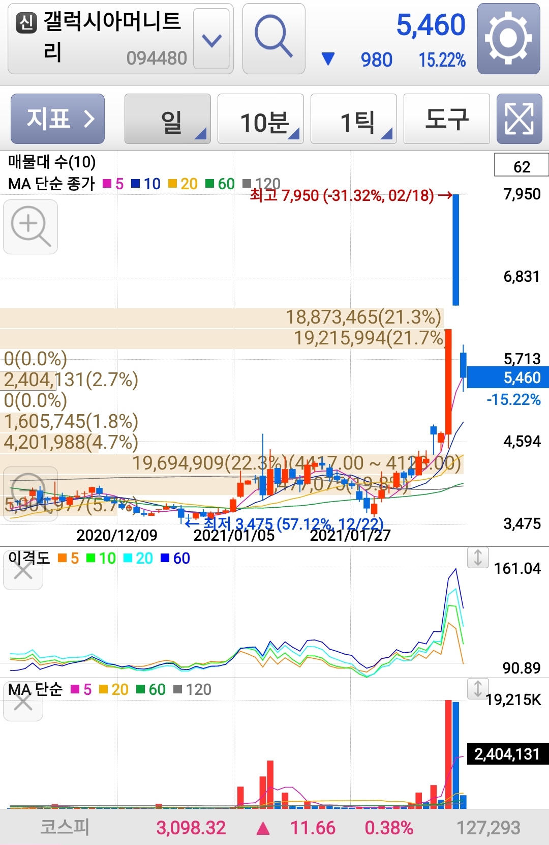2배가 튀어오른 상황이었다가, 다시 훅 떨어지고 있다.