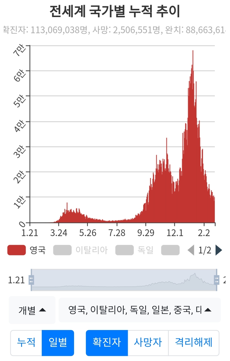 백신접종을 시작한 위험한 나라들을 보니, 확진자 수치가 확연히 줄어들었음을 알 수 있다. 바람직한 신호라 보여진다.