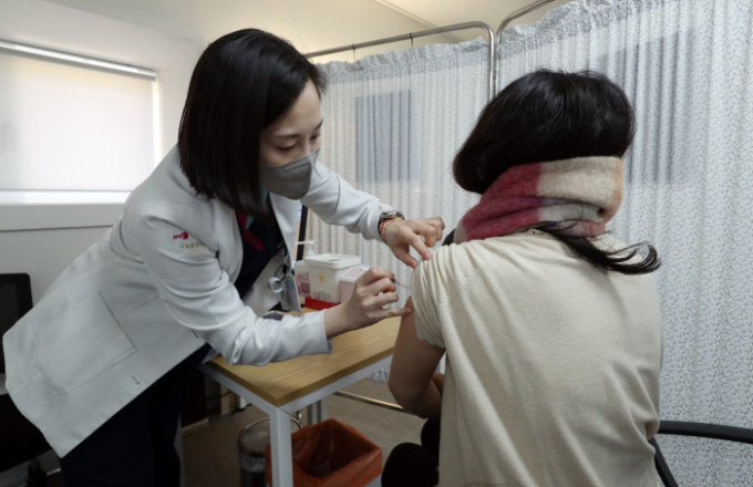 지난 9일 서울 중구 국립중앙의료원 중앙예방접종센터에서 진행된 코로나19 백신 접종 모의훈련에서 참가자들이 백신접종을 하고 있다. 사진공동취재단