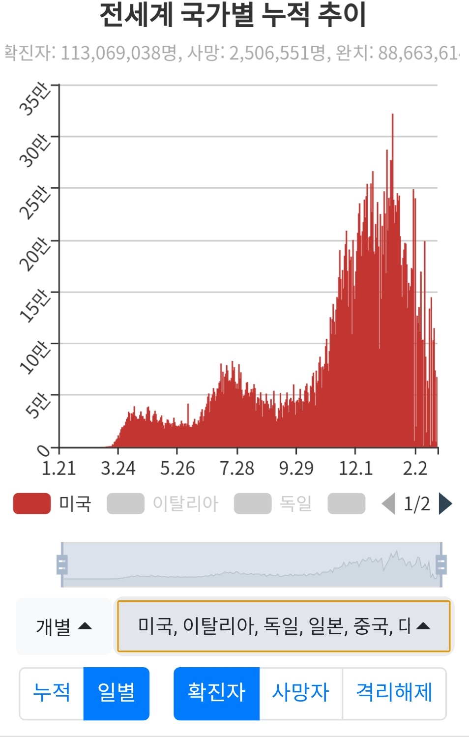 백신접종을 시작한 위험한 나라들을 보니, 확진자 수치가 확연히 줄어들었음을 알 수 있다. 바람직한 신호라 보여진다.