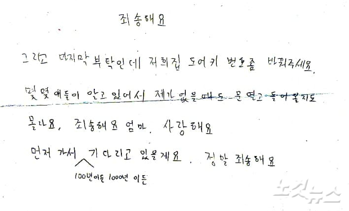 “엄마, 매일 남 몰래 울고 억울하게 괴롭힘을 당하던 시절을 끝내는 대신 이제 더 이상 가족들을 볼 수 없다는 생각에 눈물이 앞을 가려요. 마지막 부탁인데 집 도어키 번호 좀 바꿔주세요. 몇몇 애들이 알고 있어서 제가 없을 때 문 열고 들어올지도 몰라요. 죄송해요, 엄마. 사랑해요. 먼저 가서 100년이든 1000년이든 기다리고 있을게요. 정말 죄송해요.”