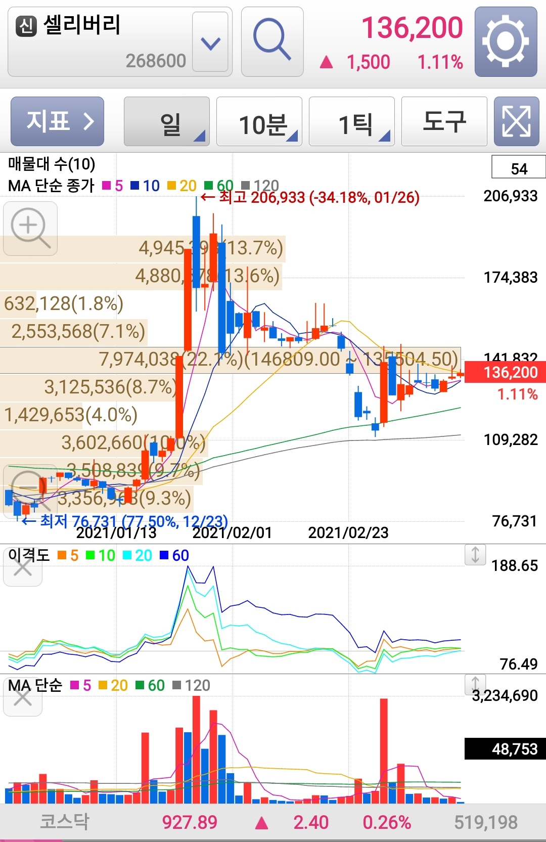 여러 호재가 있는 주식인데, 이미 크게 오른 뒤 떨어져있는 터라 관망하고 있다.