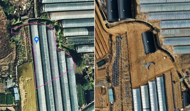 경기 광명시청 소속 공무원이 2020년 취득한 노온사동 농지의 2018년 위성사진(왼쪽)과 10일 드론으로 촬영한 사진. 비닐하우스가 사라지고 묘목을 심을 준비가 한창이다. 카카오맵 캡처·광명=서재훈 기자