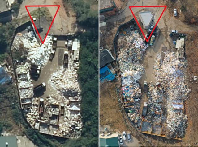 시흥시의회 한 의원이 자녀 명의로 매입한 경기 시흥시 과림동 땅의 2018년(왼쪽) 위성사진과 9일 드론으로 촬영한 사진. 쓰레기 처리장 바로 옆 공터에 2층 건물(붉은 세모 안)을 지었다. 카카오맵 캡처·시흥=뉴시스