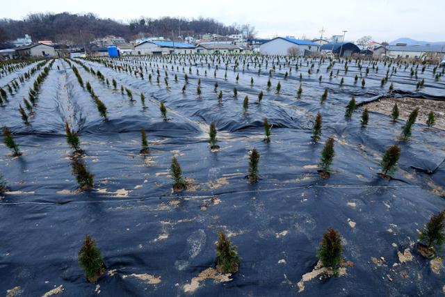4일 LH 직원들의 땅 투기 의혹이 제기된 경기 시흥시 무지내동 소재 농지에 다양한 묘목이 심겨 있다. 시흥=뉴스1