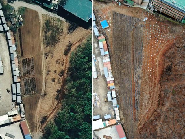 경기 광명시청 소속 공무원이 2020년 취득한 노온사동 농지의 2018년 위성사진(왼쪽)과 10일 드론으로 촬영한 사진. 비닐하우스가 사라지고 묘목을 심을 준비가 한창이다. 카카오맵 캡처·광명=서재훈 기자