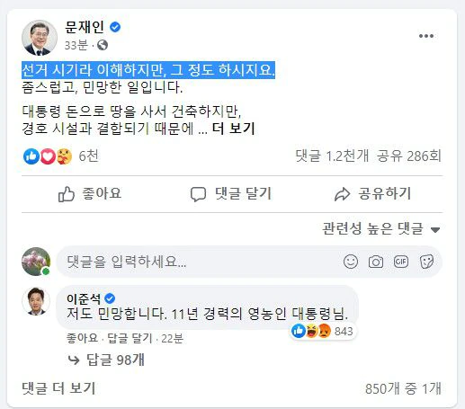 이준석 전 최고위원은 문 대통령의 글에 “저도 민망합니다. 11년 경력의 영농인 대통령님”이라는 댓글을 달았다. 그는 페이스북에 “문 대통령이 정확히 무슨 말씀을 하시는지 이해는 가지 않지만, 경호 때문에 땅을 처분할 수 없어서 괜찮다고 하시는 것 같다”며 “나중에 대통령께서 자녀들에게 상속해줄때는 이 문제가 어떻게 되는 것인지 궁금하다”고 했다.