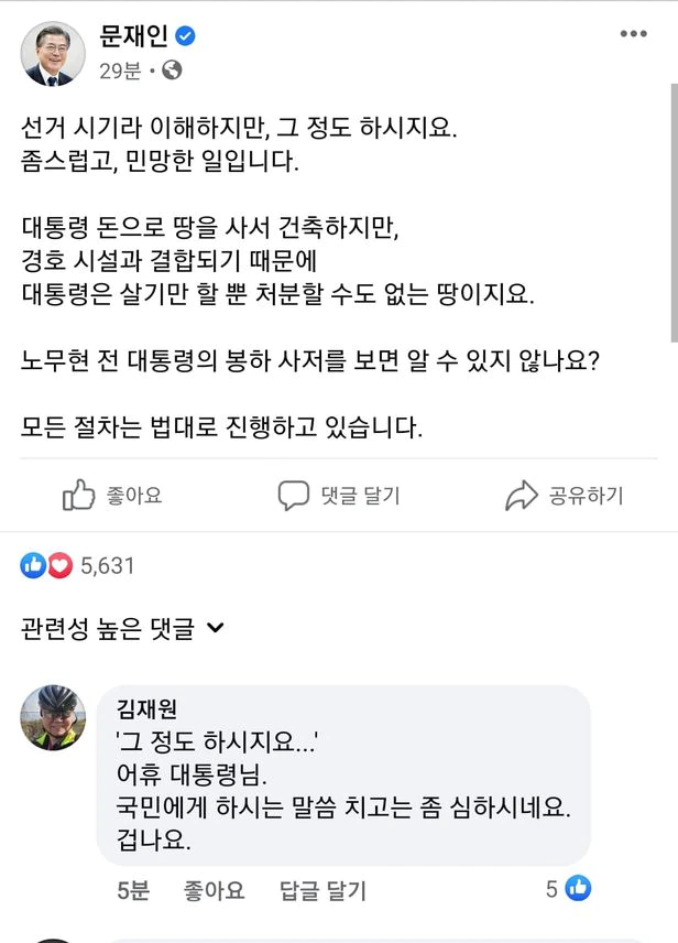 문재인 대통령이 12일 경남 양산 사저 의혹 제기를 한 야권을 향해 트위터와 페이스북에 “좀스럽고 민망한 일”이라며 쓰자, 국민의힘은 “아들 문준용씨 말버릇에 다 이유가 있었다” “노무현 전 대통령 이야기는 왜 꺼내냐”며 반격했다. 문 대통령이 쓴 페이스북 글엔 이튿날인 13일 댓글이 1만4000여개가 달렸다.