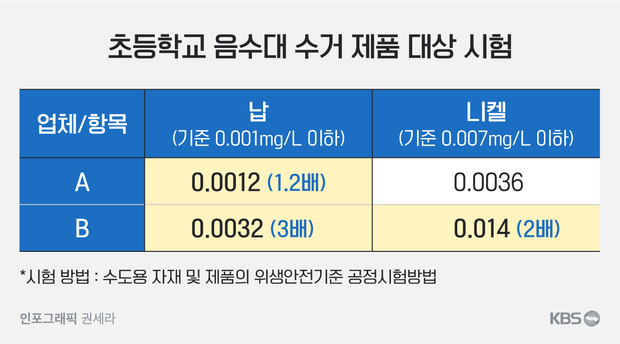 취재진은 한 초등학교 급수대에 설치된 수도꼭지를 수거해 다시 정부 지정 검사 기관에 중금속 검출 여부 시험을 의뢰했습니다. 처음 시험을 했던 제품들 가운데 A사 제품 1개, B사 제품 2개였습니다.