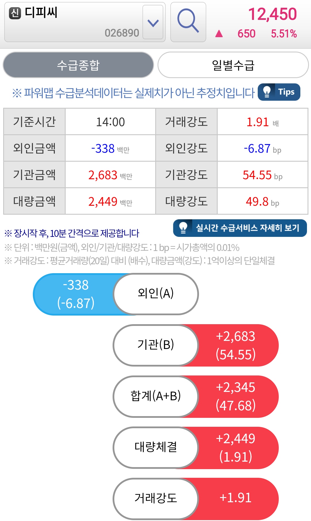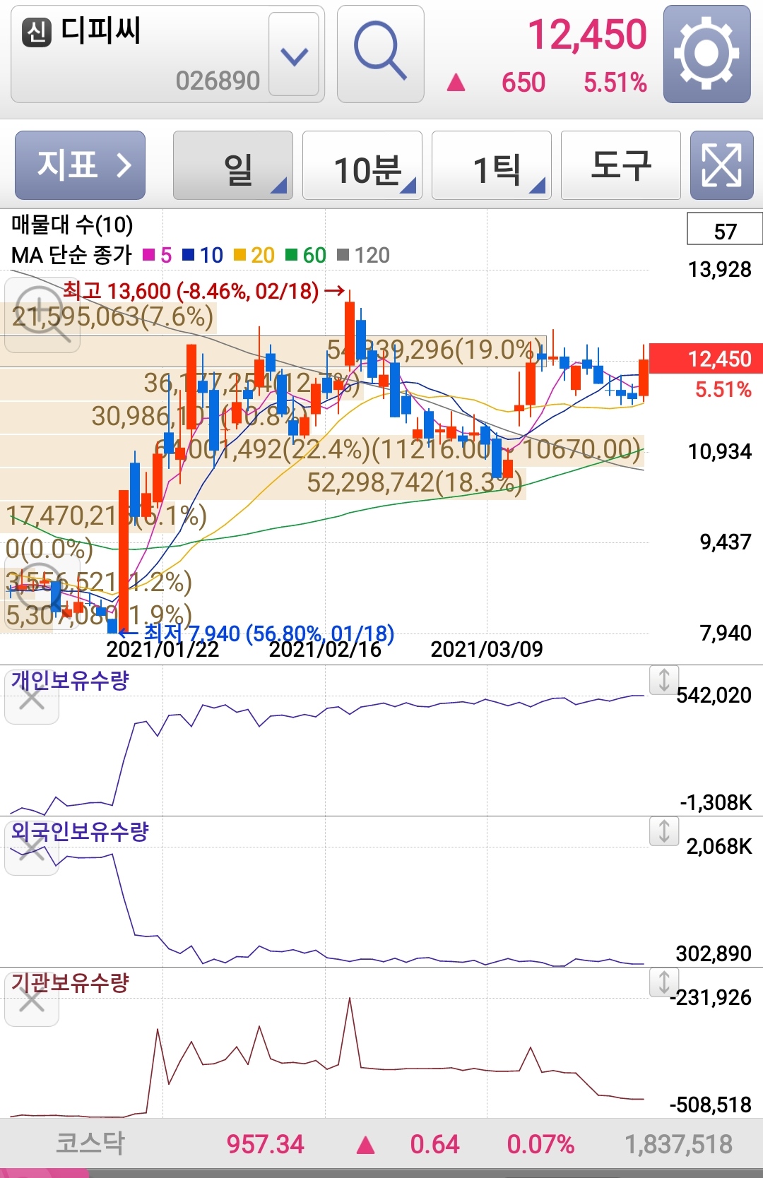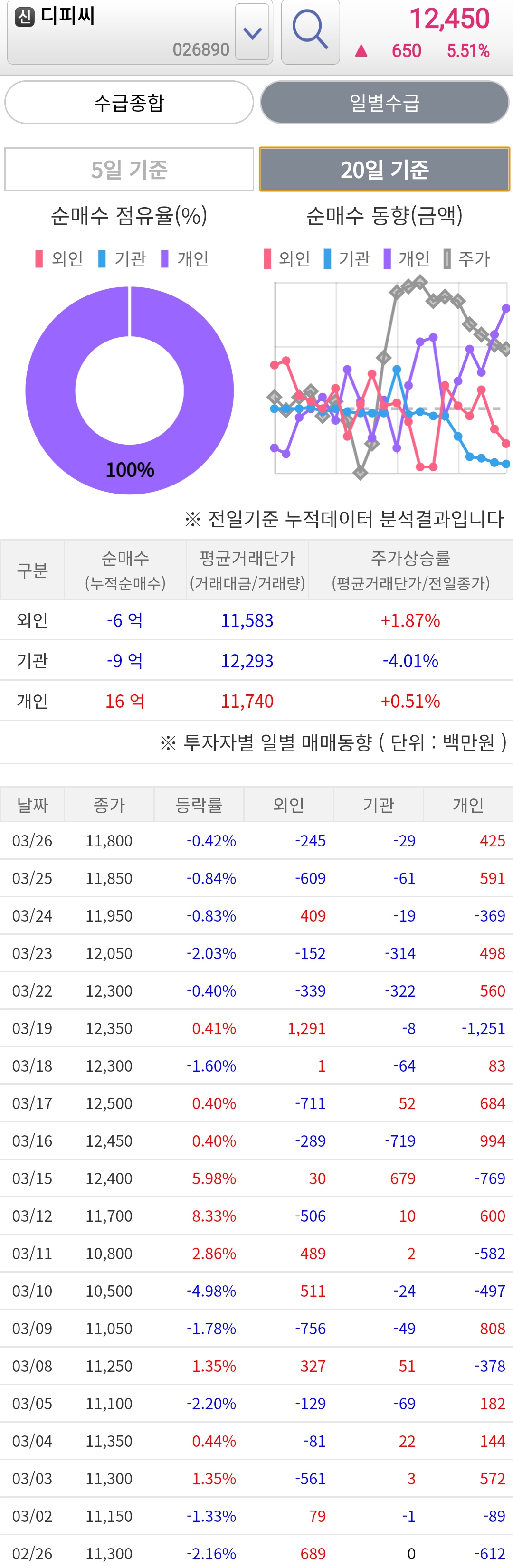 [투자자별일일매매동향] [일별수급 20일기준 - 디피씨] 외인은 매도하고, 기관은 매수하고, 에 따라 주가가 움직이는 것으로 예상되며 개인도 매수에 동참하고 있음