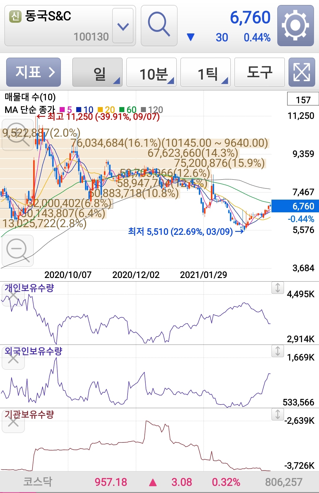 개인은 보통 저점에서 팔고, 고점에 물리는 경향이 있는데, 지금이 그런 상황으로 보여진다.