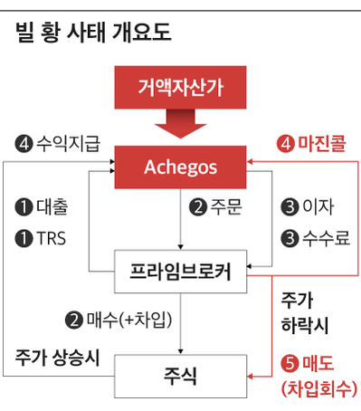 이번에 ‘마진콜(margin call)’로 월가를 뒤흔들었던 아케고스 캐피털 매니지먼트(Archegos Capital Management)는 빌 황이 2013년 타이거 아시아를 개인 투자회사로 전환한 것이다. 마진콜은 선물이나 펀드의 투자원금에 일정 수준 이상 손해가 발생할 경우, 증거금을 추가로 납입하라고 투자은행(IB) 측이 요구하는 행위다.