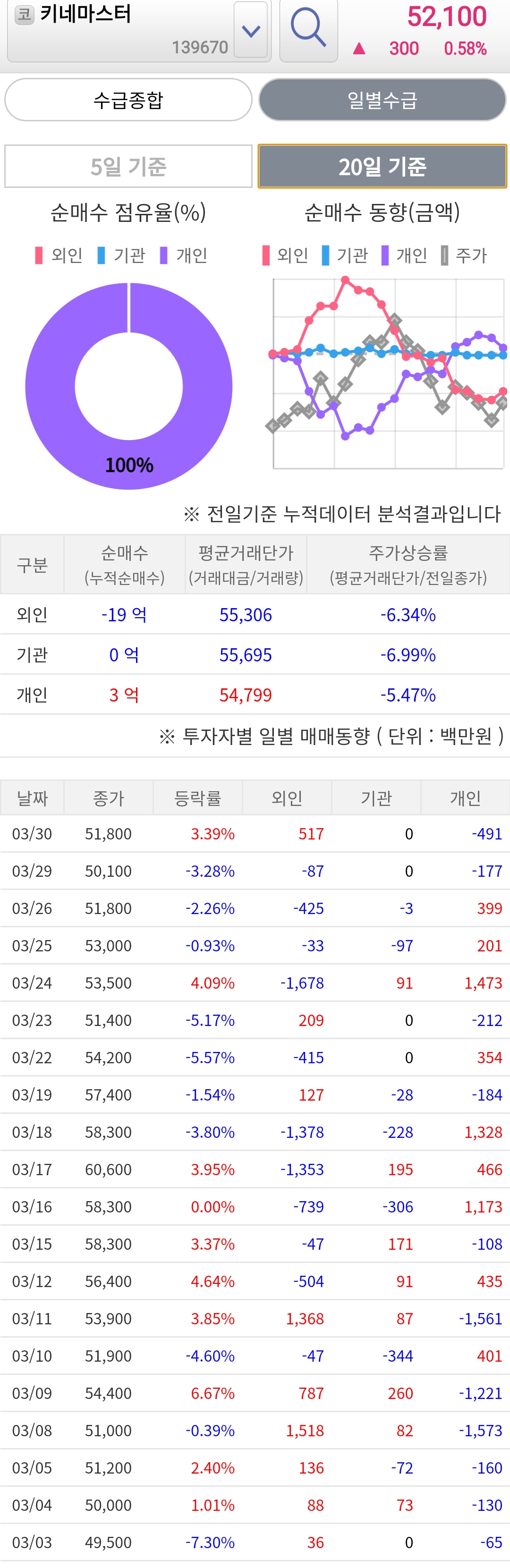 기관은 여전히 관망중이다. 외인은 활발히 움직이고, 개인은 털리거나 버티고, 기관은 중간선을 지키고 있다.